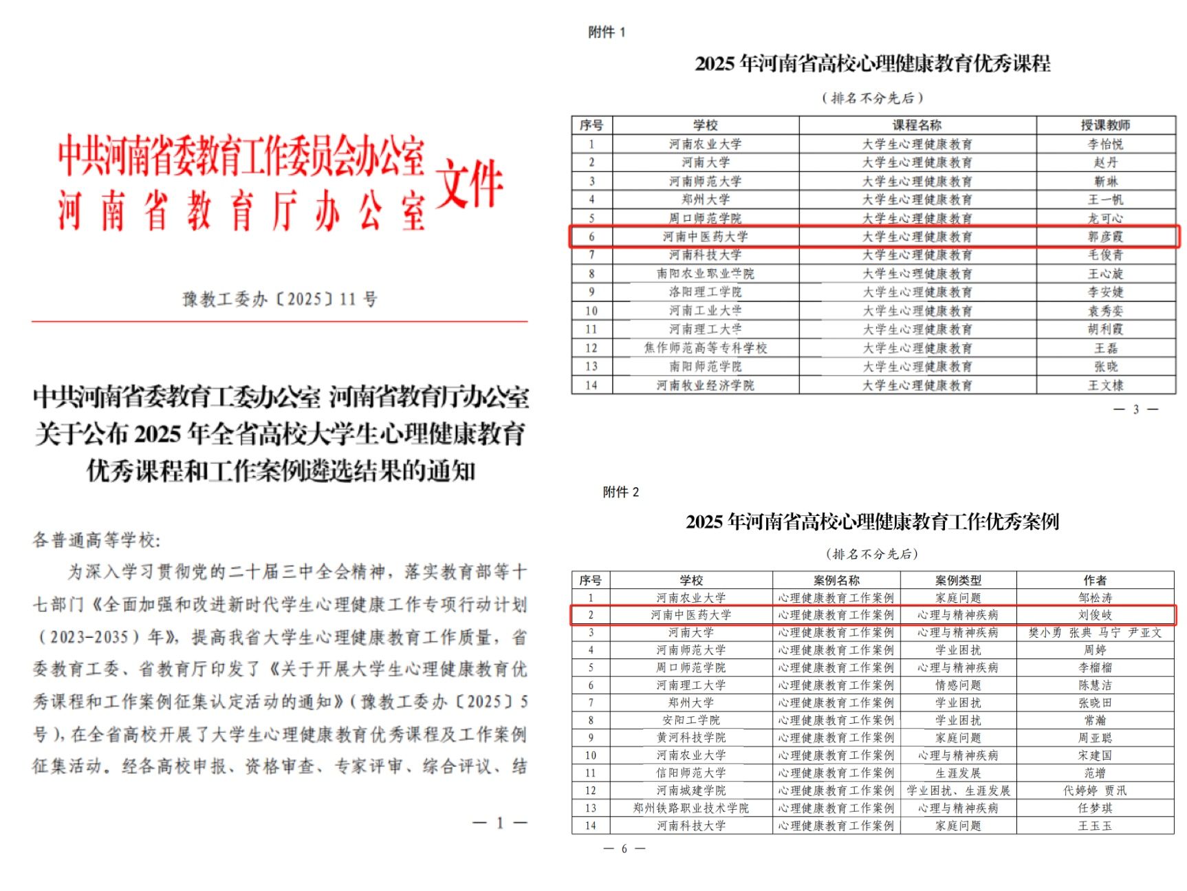 本网讯(文图/王海飞 刘俊岐)近日,河南省委教育工委、河南省教育厅发布《关于公布2025年全省高校大学生心理健康教育优秀课程和工作案例遴选结果的通知》,星空在线登录官网郭彦霞老师主讲的《大学生时间管理》获评“2025年河南省高校心理健康教育优秀课程”,刘俊岐老师申报的工作案例获评“2025年河南省高校心理健康教育工作优秀案例”。